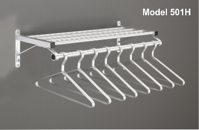 The most popular model for coat hanging, the Glaro 501H wall-mounted coat rack gives you what you need in one order. Solid aluminum hangers are included, 4 per foot of rack. Unlike chrome-plated steel, these racks will never rust and are widely used in gym shower areas and seaside locations. Available in custom lengths long enough for a church, hotel or casino. Contact us if you need a length longer than what is shown here. Click here to order additional hangers. Click here to for the installation sheet.